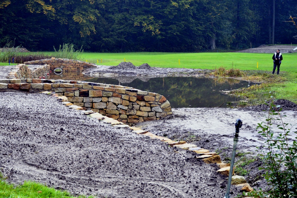 Neuer Blickfang an der großen Allee. Ein kleiner Teich mit Bruchsteinmauern und zwei Brücken für die Golfer. Fotos: Hilgemann |